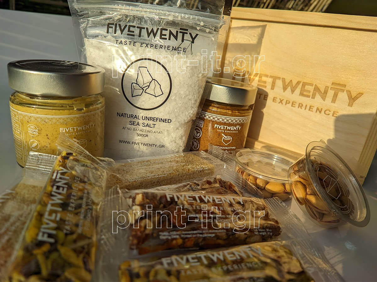 Ένας απο τους αγαπημένους μας παραγωγούς που στήριξε την ανάπτυξη του branding της επιχείρησής του με μεγάλη επιτυχία, ονόματι FiveTwenty, παράγει στο εργαστήριό μας ευφάνταστες και εντυπωσιακές αυτοκόλλητες ετικέτες για κάθε είδους χρήση. Ντύνει τα περισσότερα προϊόντα του με ανθεκτικές διάφανες ετικέτες, απο τα βαζάκια για το μέλι και το φυστικοβούτυρο και τα καπάκια τους μέχρι και τα σακουλάκια για το αλάτι ή τα περιτυλίγματα για τις μπάρες φιστικιών του.