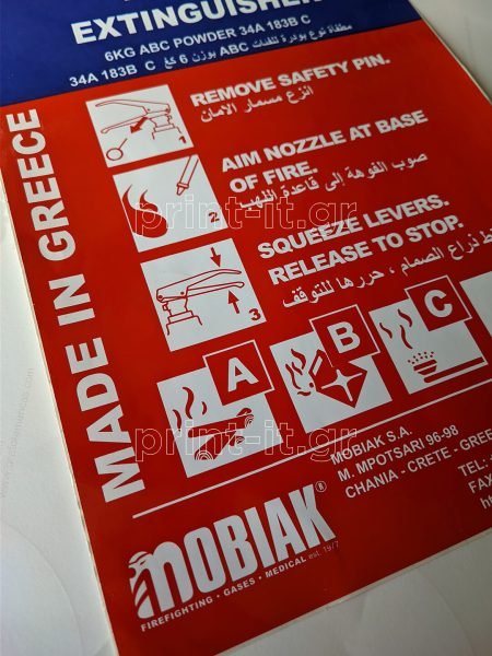 Οι αυτοκόλλητες ετικέτες μας έχουν ισχυρή & ανεξίτηλη εκτύπωση μεταξοτυπίας υψηλής αντοχής – ιδανικές για όλες τις ανάγκες σήμανσης του πυροσβεστήρα. Το εργαστήριό μας παράγει όλων των ειδών τις ετικέτες σήμανσης, ετικέτες οδηγιών, ετικέτες αναγόμωσης και ετικέτες ελέγχου που μπορεί να χρειαστείτε. Παράγουμε όλα τα μεγέθη & σχήματα και σε διάφανο υλικό.